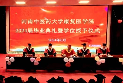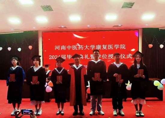 学院副院长刘斌通报2024届毕业生授予学位情况和2024届毕业生取得的优秀成绩;教师代表陈岩表达了对毕业生的深深祝福和殷切期望,希望同学们努力拼搏,再创佳绩;河南省优秀毕业生、2019级中医康复学本科班王宁怡,以及河南省三好学生、2021级医学技术研究生丁志敏分别发表感言,分享了自己在校期间的学习经历和成长感悟,激励同学们要勇敢追求梦想,坚持不懈奋斗;学院党委副书记李伟峰、孟长海分别为省级优秀毕业生和校级优秀毕业生颁发荣誉证书并赠送毕业纪念品。与会领导为2024届硕士、本科毕业生扶正流苏并合影留念。