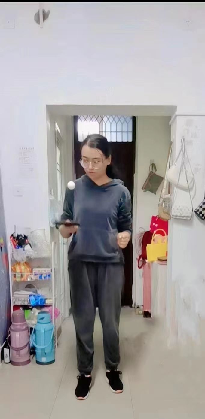 单手拿一个乒乓球拍,颠乒乓球,成绩为一分钟颠乒乓球的总数。
