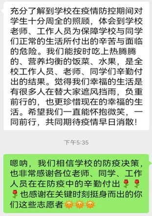 在采访的最后,芝兰同学还表示:“通过参与志愿服务,我充分了解到了学校在疫情防控期间对学生的周全照顾,体会到学校老师、工作人员为保障同学们正常的生活所付出的辛苦与面临的危险。我们能按时吃上热腾腾的、营养均衡的饭菜、水果,是全校工作人员、老师、同学们辛勤付出的结果。正是因为有很多人在替大家遮风挡雨、负重前行,我们才有幸福的生活。”