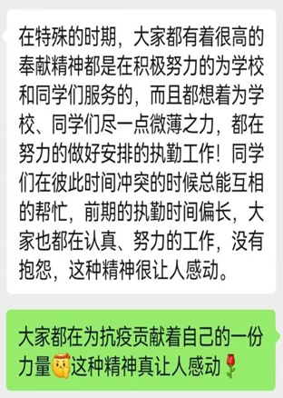 当问及对本次志愿服务印象最为深刻的事时,芝兰同学这样说:“在特殊的时期,每一名志愿者都有着很高的奉献精神,大家都在积极努力地为学校和同学们服务,尽一份自己的微薄之力,努力地做好安排的工作。当执勤遇到时间冲突的情况时,大家彼此会互相帮忙,前期执勤时间偏长,大家也都在认真地工作,没有抱怨,这种精神很让人感动。”