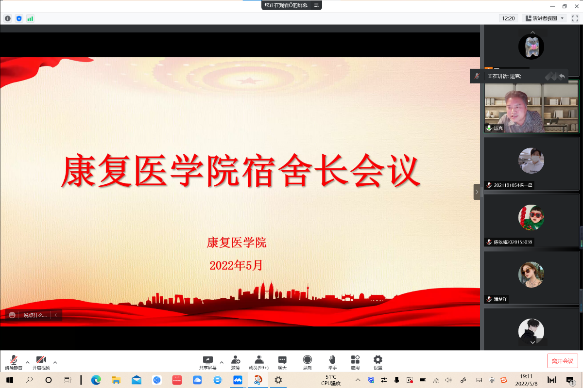 (文/张羽萍 图/杨一晨)为进一步增强同学们的防疫意识,做好近期疫情防控工作,2022年5月8日19:00迷妹网 以腾讯会议形式召开宿舍长工作会议。迷妹网 党委书记张运克、院长冯晓东、党委副书记孟长海,副院长许国防、刘斌以及全体辅导员、班主任、主要学生干部及全体宿舍长参加了线上会议,其余同学听会。本次会议由学院党委副书记孟长海主持。