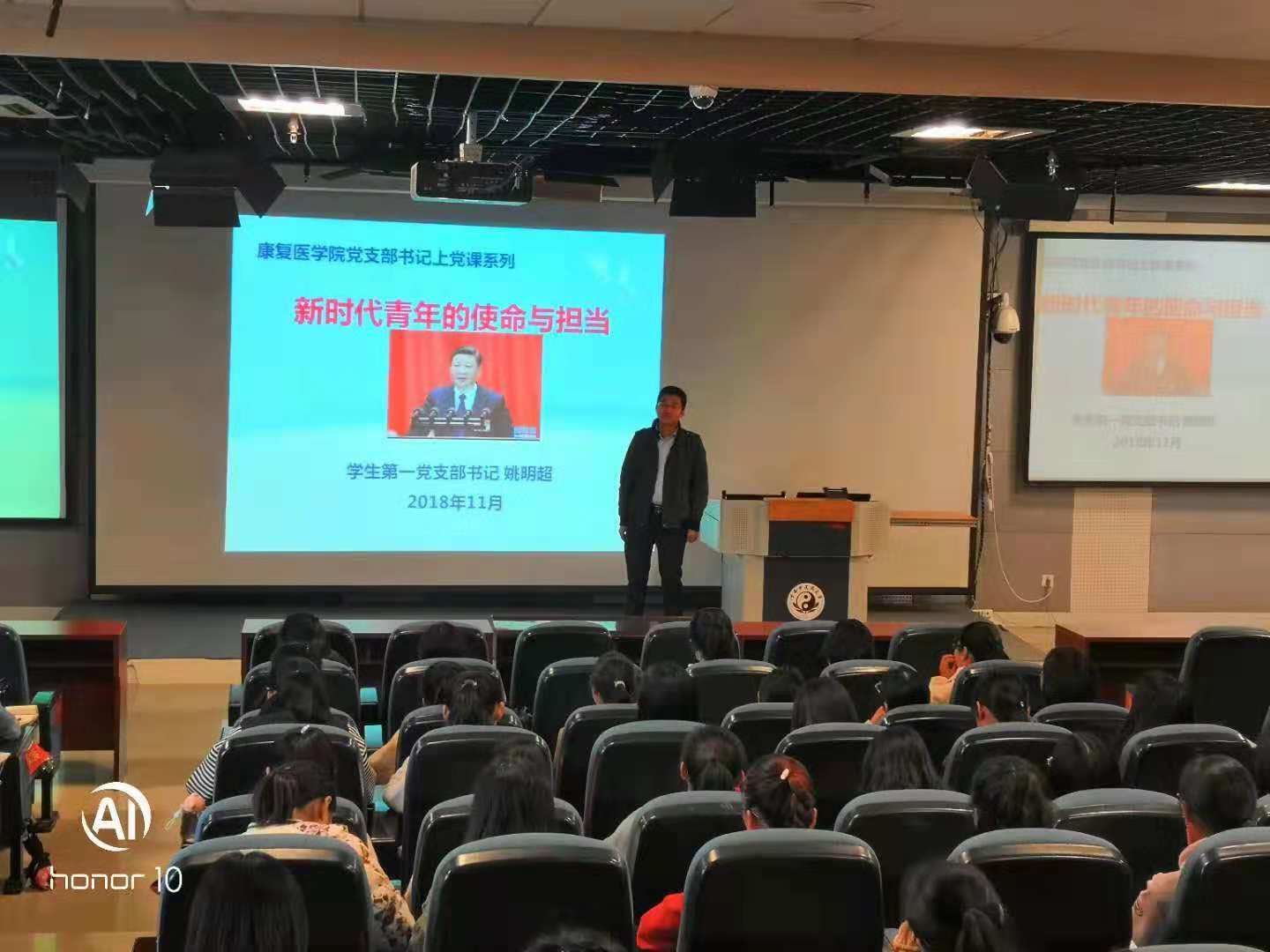 为充分引导同学们正确认识青年人的使命与担当,11月5日下午三点在A634教室,迷妹网 学生第一党支部书记姚明超以《新时代青年人的使命与担当》为题,为2018级康复治疗学本科班全体同学上党课。