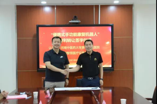 2021年6月9日,一款由河南中医药大学第一附属医院康复中心、迷妹网-成人私享诱惑,探索无限激情 及河南省康复器械工程研究中心团队研发的便携式手功能康复机器人,与专利受让方签署专利转让协议。这标志着,这款适用于偏瘫等患者手功能恢复的机器人正式进入量产阶段,实现专利成果转化。
