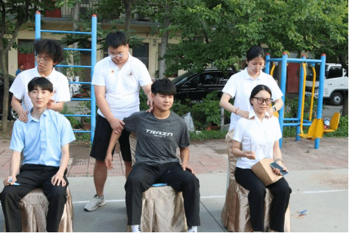(康复朝阳社会实践服务团成员为员工按摩推拿)