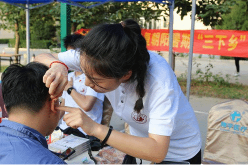(康复朝阳社会实践服务团成员为员工贴耳穴贴)