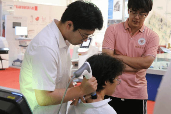 在八段锦晨练结束后,由翔宇医疗人事部经理丁旭光带领服务团成员对康复器材展区进行参观和介绍。在展区内,成员们经工作人员介绍以及亲身体验对各类康复医疗器械有了更进一步的认识。比如冲击波治疗仪,可以有效的从深层次的松解肌肉,降低肌张力,具有改善组织微循环,加快代谢分解产物的清除作用,还可提高疼痛阈值,从而减轻痛感,通常对于颈肩腰腿痛疾病,有较好的辅助治疗效果。