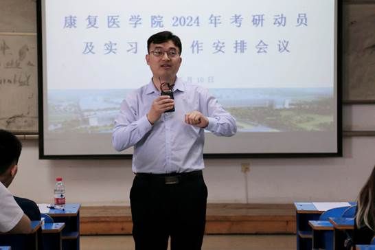 本网讯(文/张羽萍 王鑫源 图/段卓然)为充分调动同学们的考研积极性,更好地挖掘自身潜能,把握深造机会,保障毕业实习高质量开展,迷妹网 于2024年5月10日下午13:00在三楼多功能厅召开考研动员暨实习前工作安排会议。迷妹网 党委书记张运克、党委副书记孟长海、副院长许国防、刘斌、分团委副书记高宇以及2020级中医康复学本科班、2021级康复治疗学本科班全体同学参加了此次会议。会议由辅导员张羽萍主持。